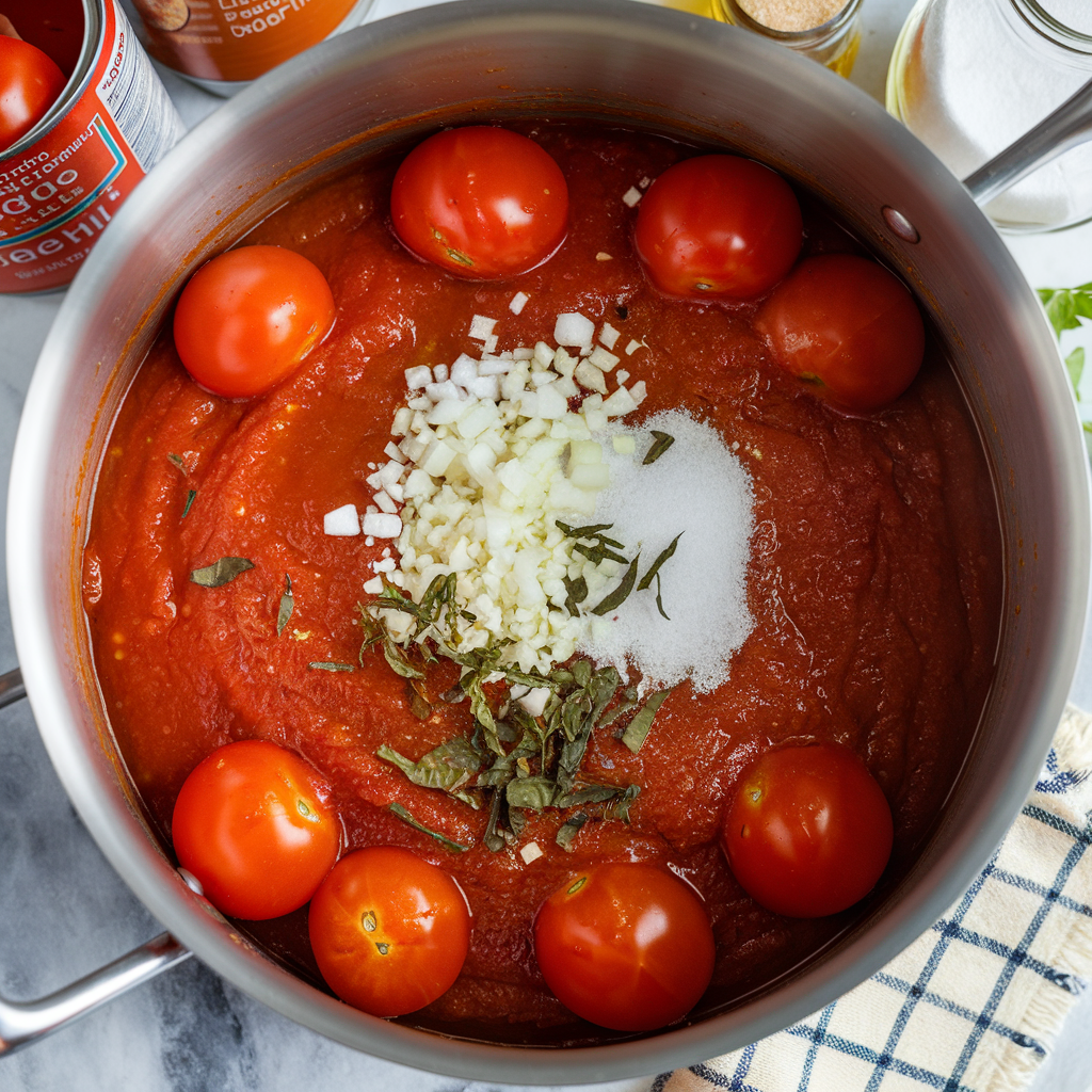 Heat olive oil in a large, heavy-bottomed stock pot. Add onions and sauté until translucent (about 5 minutes). Add garlic and sauté for another 30 seconds—stopping before browning occurs prevents any bitter notes in your final sauce.