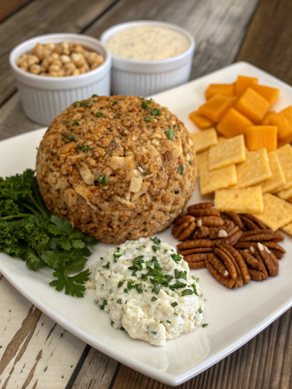 For a stunning presentation, place the cheese ball on a wooden board with concentric circles of accompaniments radiating outward.