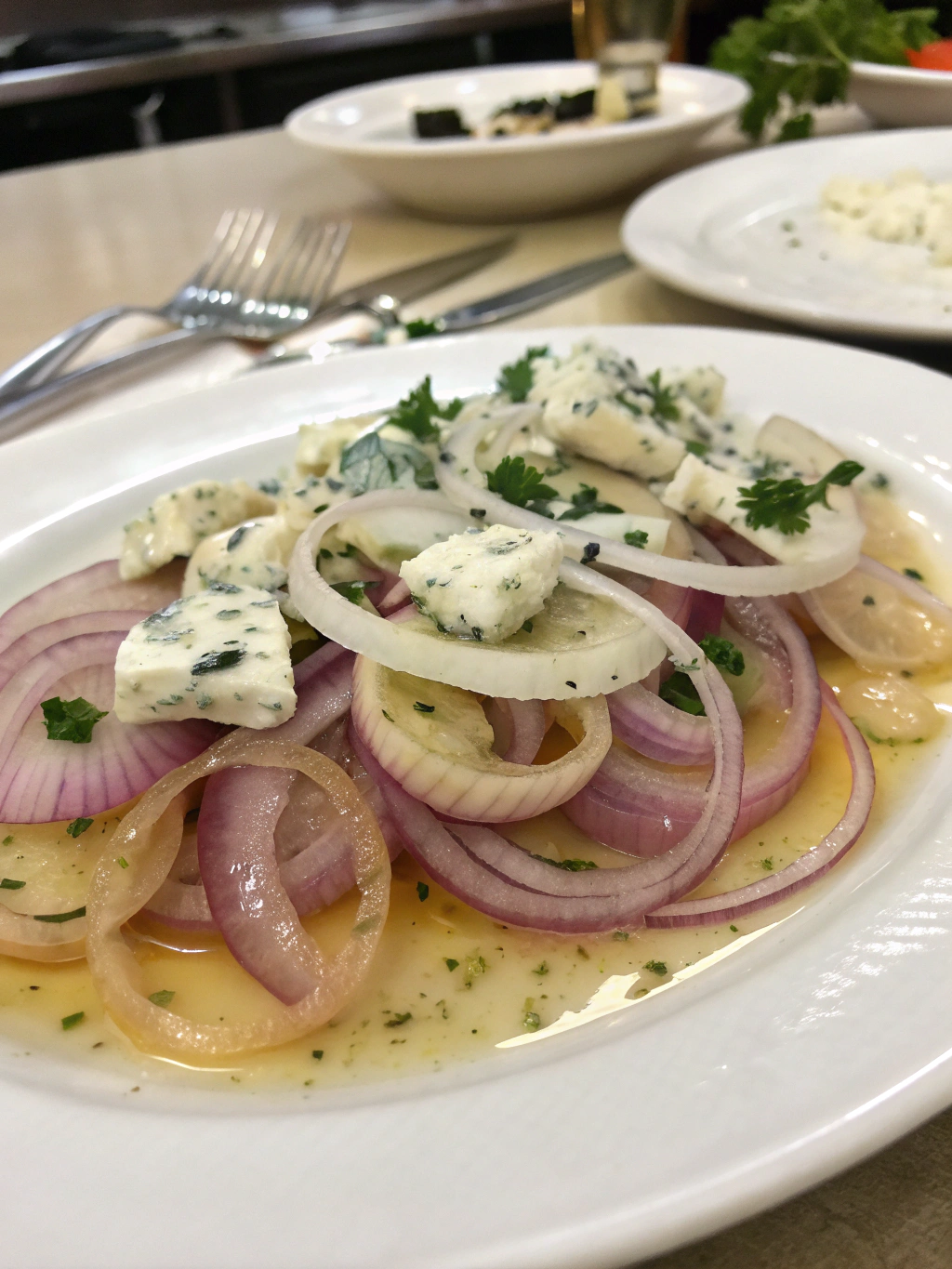 For an impressive presentation, serve in small, individual portions using shallow white dishes that highlight the vibrant colors of the marinated onions blue cheese combination.
