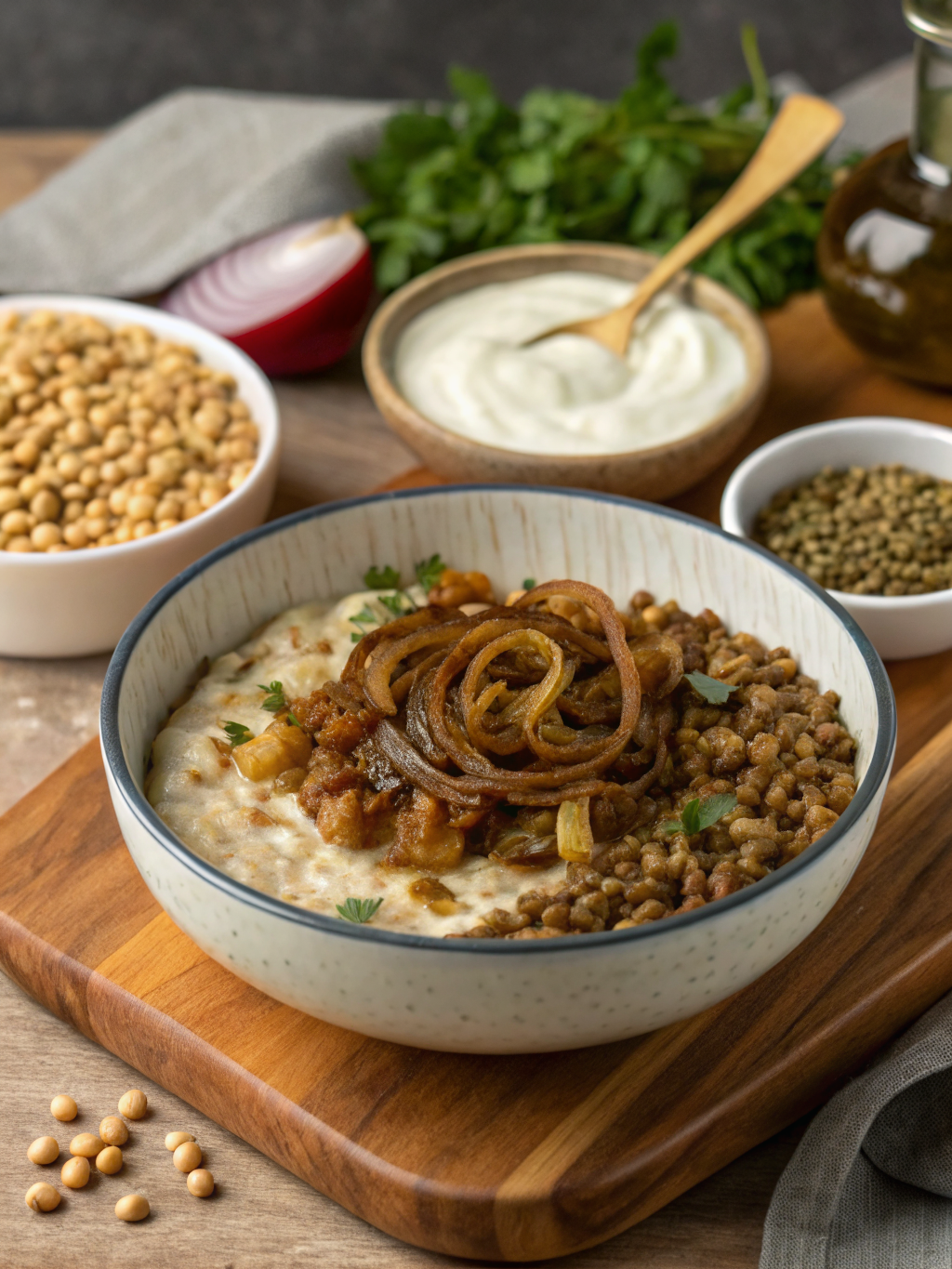 Form the mujaddara into a mound on a large platter, create a well in the center, and fill with extra caramelized onions and toasted pine nuts. Drizzle with olive oil and scatter fresh herbs around the edges for restaurant-quality presentation.