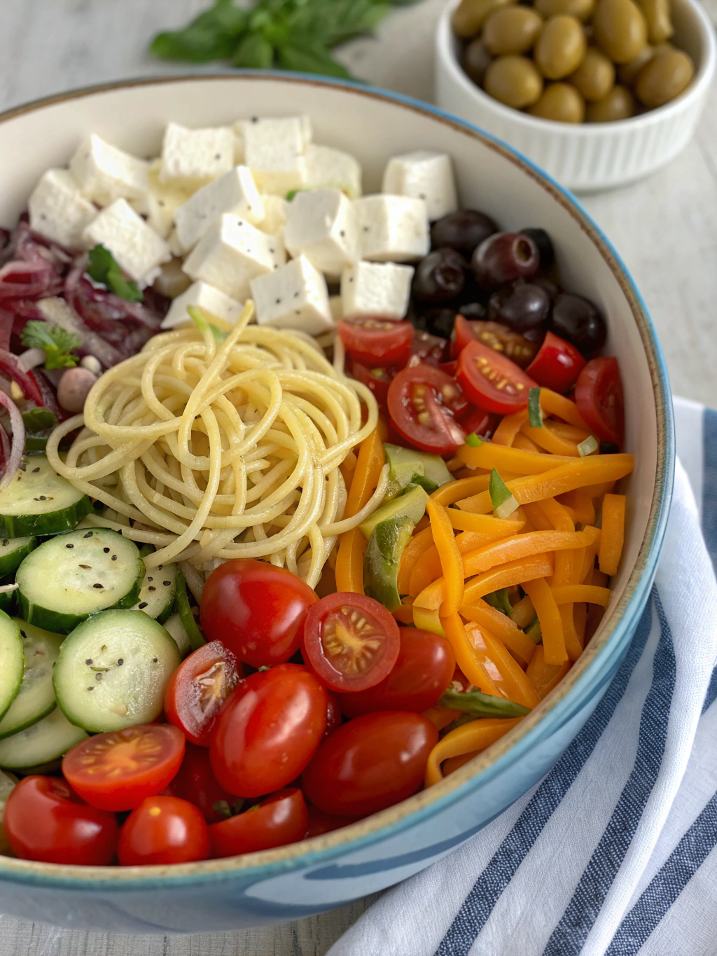 Add cooled pasta to a large serving bowl. Pour two-thirds of the dressing over the pasta and toss well to coat. Then add cherry tomatoes, cucumber, bell pepper, red onion, black olives, and mozzarella pearls. Fold gently to combine without breaking the pasta strands.